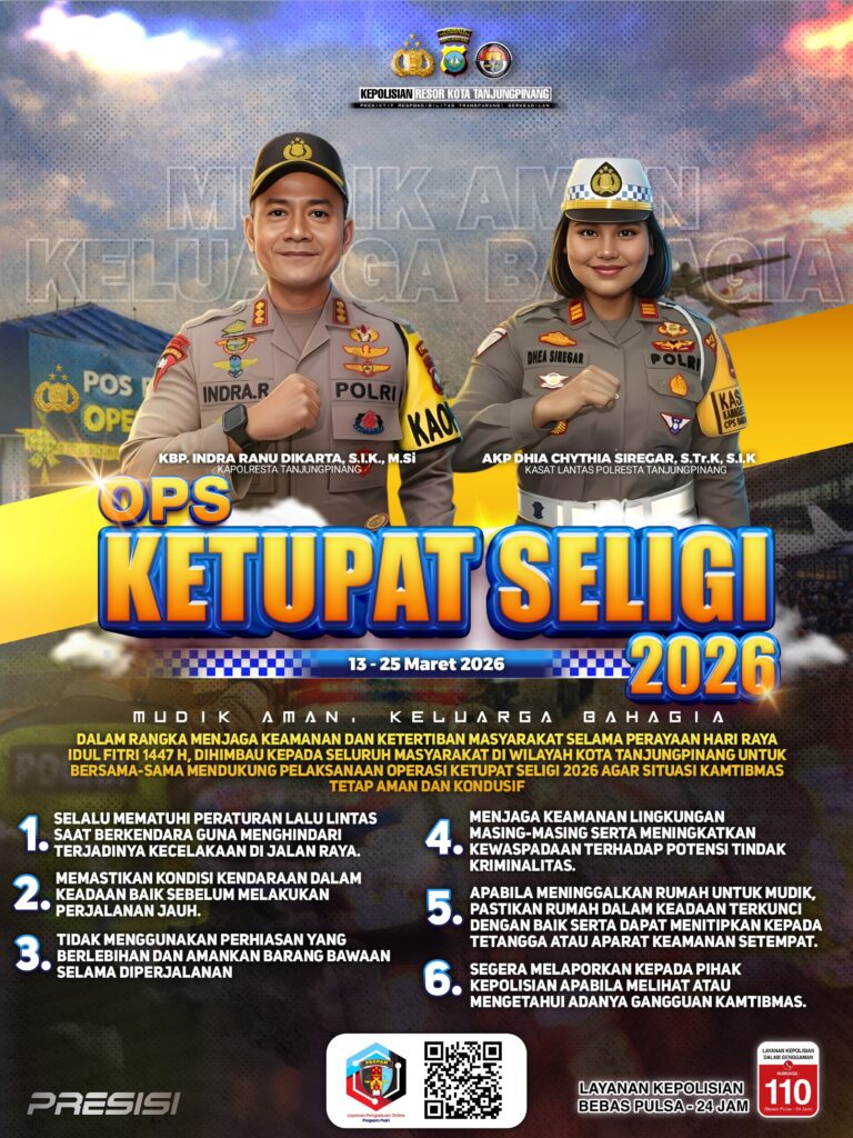 “Dalam rangka menjaga keamanan dan ketertiban masyarakat selama perayaan hari raya Idul Fitri 1447 H, kami juga menghimbau kepada seluruh masyarakat kota Tanjungpinang untuk bersama-sama mendukung pelaksanaan operasi Ketupat Seligi 2026 agar situasi tetap aman dan kondusif”, terang Kapolresta Tanjungpinang Kombes Pol. Indra Ranu Dikarta, S.I.K., M.Si.