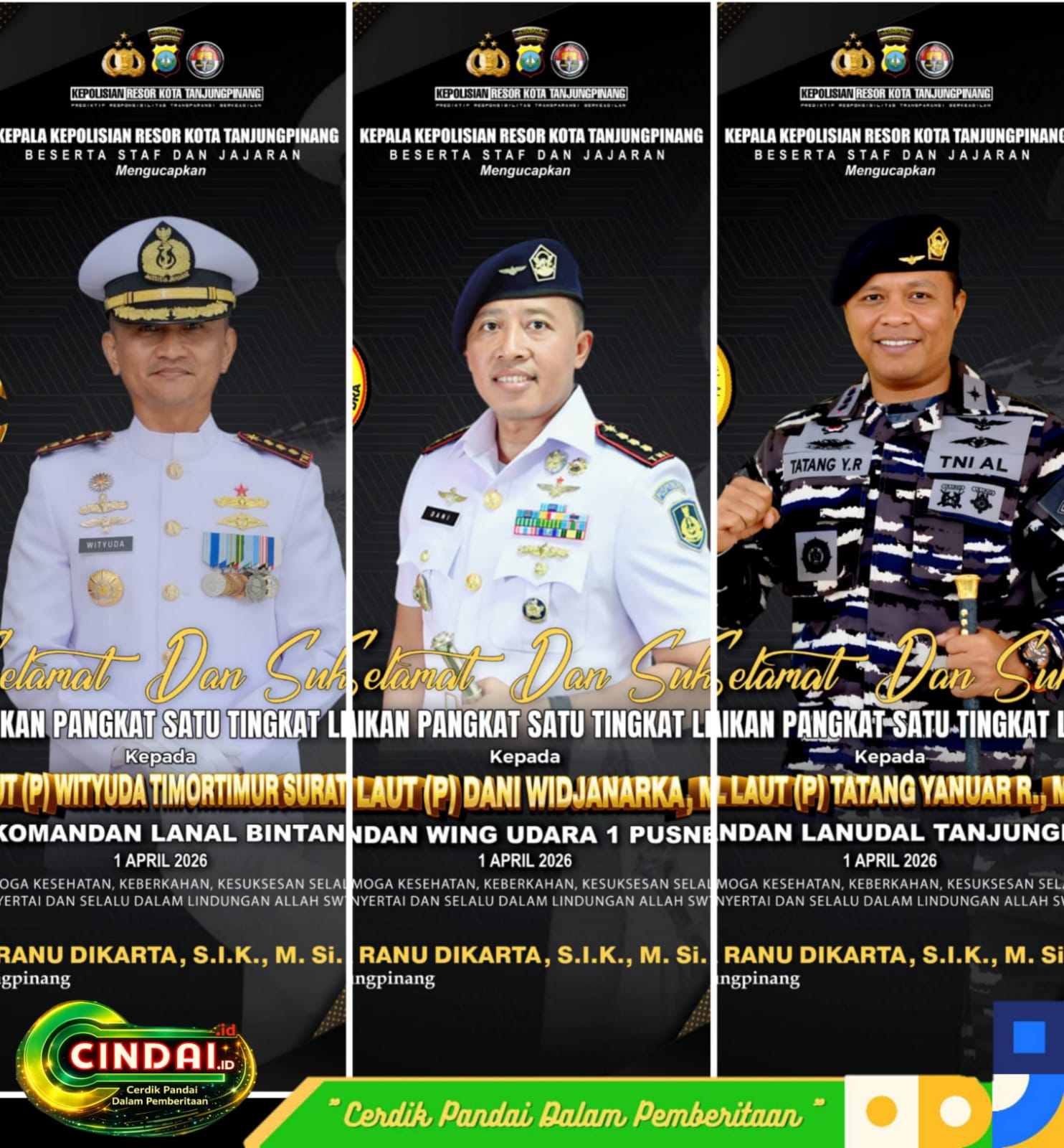 Tanjungpinang (Cindai.id) – Polresta Tanjungpinang menyampaikan ucapan selamat dan sukses atas kenaikan pangkat satu tingkat lebih tinggi kepada sejumlah Perwira TNI Angkatan Laut yang bertugas di wilayah Kepulauan Riau, khususnya Tanjungpinang dan Bintan.